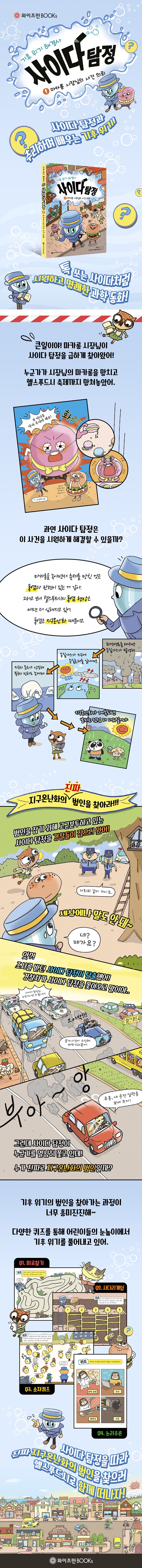 과학과 수학 분야 전문 출판사 와이즈만북스에서는 현재와 미래의 가장 핫한 키워드 중 하나인 ‘기후 위기’를 주제로 시리즈를 기획하고, 첫 번째 책으로 《기후 위기 해결사, 사이다 탐정 1: 마카롱 시장님의 사건 의뢰》를 출간했다. 1권은 ‘폭염’을 주제로 한다. 사이다 탐정과 조수 버거, 발명가 봉이가 헬스푸드시에 사는 인물들의 의뢰를 해결해 주며, 기후 위기 문제를 과학적으로 접근한다. 그리고 기후 위기를 해결하기 위한 방법을 고민하고 실천하는 모습을 통해 어린이들이 기후와 환경에 대해 생각하고, 친환경 마인드를 가질 수 있도록 하였다.