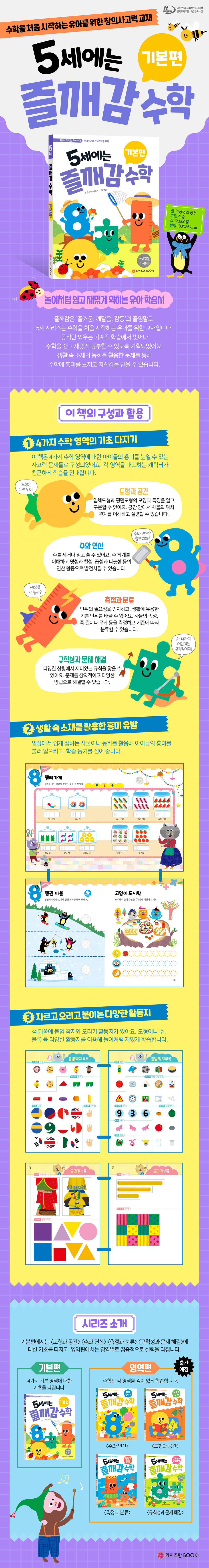 유아 수학에서 제일 중요한 것은 수학에 대한 첫인상을 만드는 것입니다. 처음 접하는 수학 교재가 재미없고 어려우면 ‘난 수학이 싫어, 난 수학을 못해’라는 고정관념이 생기게 됩니다. 이는 초, 중, 고 과정의 수학에 대한 태도를 결정하게 되므로 유아 시기에는 수학에 재미를 알게 하고, 성취감을 느끼게 해 주는 것이 중요합니다. 따라서 유아들의 눈높이와 경험이 잘 반영되어 있는가를 신중하게 따져야 합니다. 유아들의 사고와 인지 능력을 고려해야만 호기심과 흥미를 자극할 수 있기 때문입니다. 또한 생활 속 주제를 다루는 친근한 스토리텔링으로 되어야만 문제를 쉽게 이해할 수 있습니다. 「즐깨감 수학」이야말로 수학을 정말 재미있게 만들어 줄 수 있는 시리즈입니다.