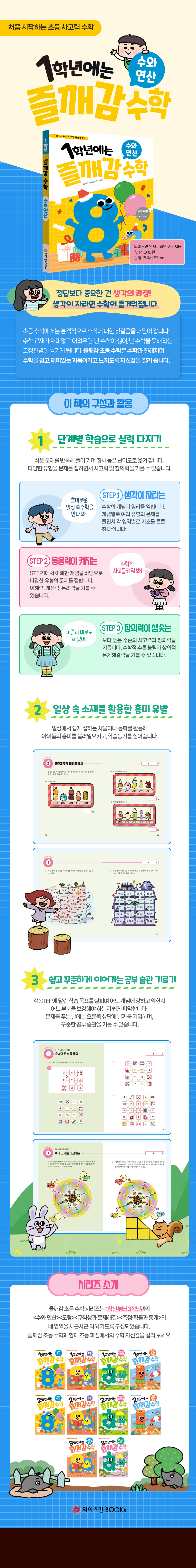 정답보다 중요한 것은 생각의 과정이라는 관점에서 초등 수학의 첫걸음을 제안한다. 재미없고 어렵다는 인식이 고정관념으로 굳어지기 쉬운 시기에, 일상 속 소재와 다양한 유형을 통해 수학을 쉽고 즐겁게 느끼도록 돕는다. 수학에 대한 흥미와 성취감을 함께 키우는 데 초점을 맞춘다.