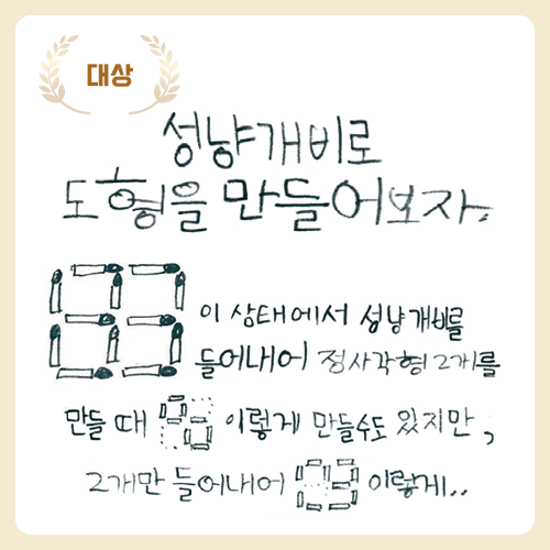 제 14회 창의력 글쓰기 대회 수학일기 대상와이즈만 영재교육 인천청라센터 3학년 백건우오늘은 수업 시간에 성냥개비로 도형을 만들어 보았다. 성냥개비로 숫자를 만들고, 성냥개비를 옮...